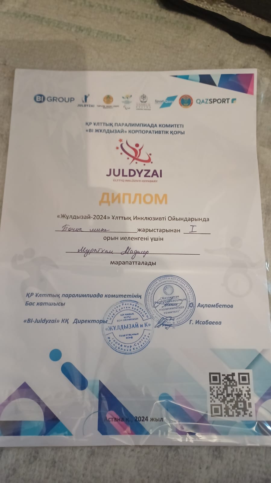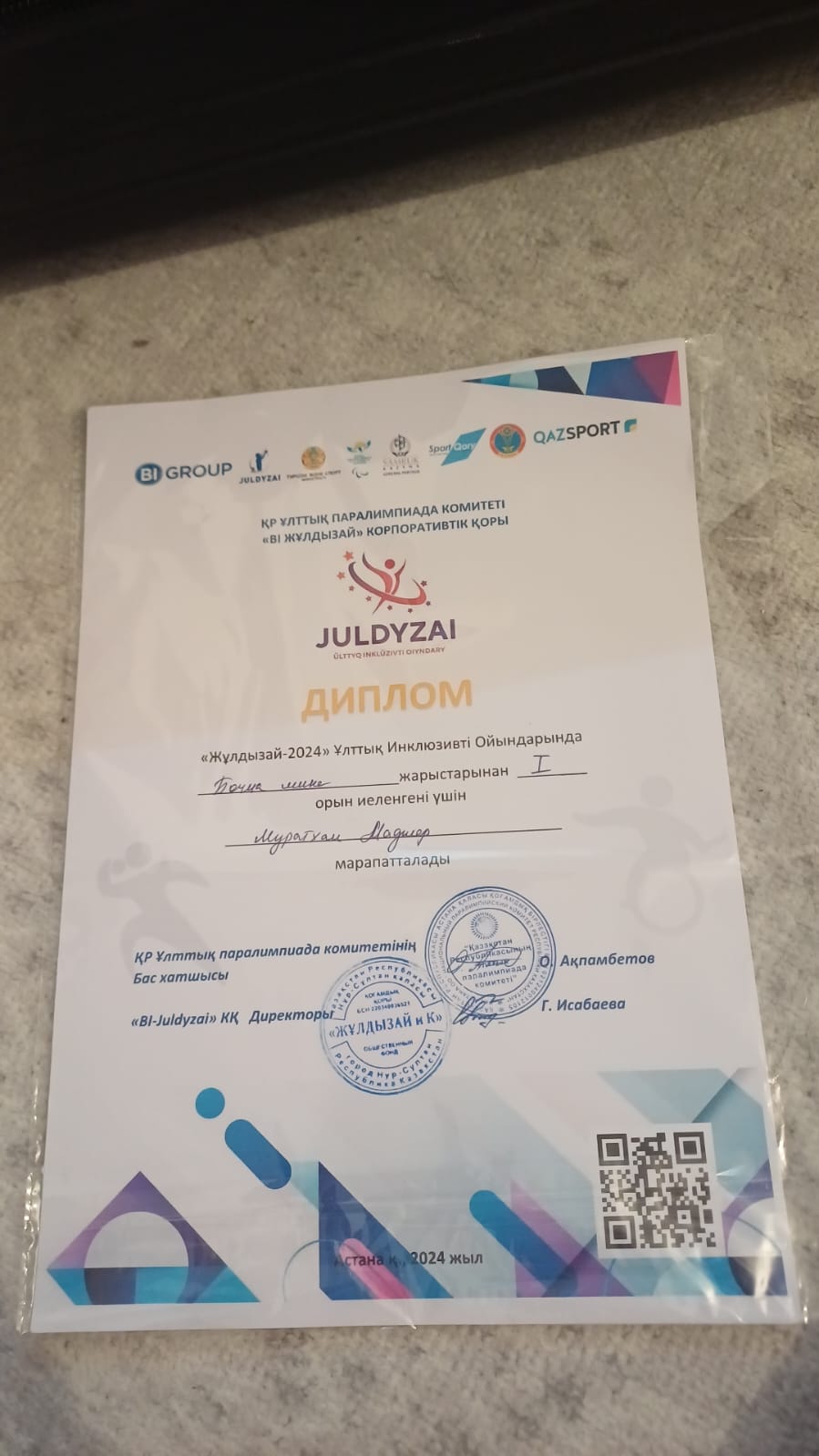 «Жетісу облысының жұмыспен қамтуды үйлестіру және әлеуметтік бағдарламалар басқармасы мемлекеттік мекемесінің «Бәйтерек» күндіз болу орталығы» коммуналдық мемлекеттік мекемесінде «Жігер» тобының арнаулы әлеуметтік қызмет алушысы Мұратхан Мадияр Астана қаласында өткізілген «Жұлдызай — 2024» Ұлттық Инклюзивті ойындарында БОЧЧА — жарыстарынан І — орын иеленді.